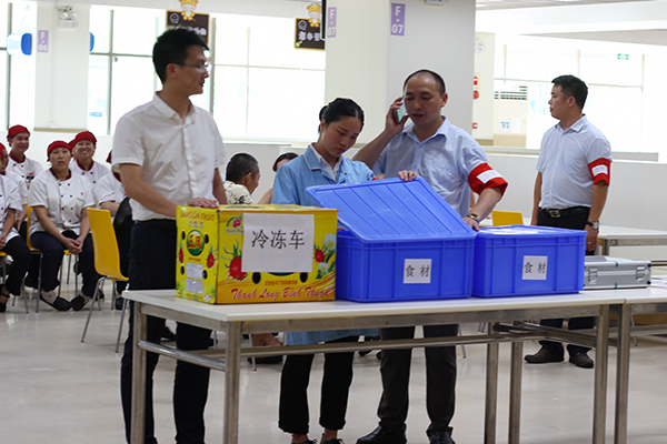 一般情況下,如果出現(xiàn)冷凍車故障、食材報廢該怎么辦呢?司機、餐廳負責人、企業(yè)負責人、采購、倉管、檢測員等主要人員模擬出在限時應急處置的狀況。