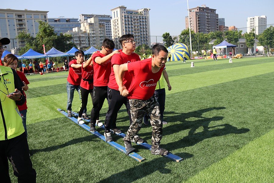 準備過后比賽就開始了。第一個項目《敢挑重擔》,每個參賽團隊派出10名隊員抬起5米直徑的大彩球,在指定場地上繞一圈返回起點,誰先到達終點誰就贏了,別看氣球不重,但如果隊員之間不協(xié)調(diào)好就很容易撐不住,之前的努力就前功盡棄了。還有同樣有趣的項目等著大家——《重走長征路》,每隊同樣派出10名隊員,其中五人在起點,另外五人在終點,隊員們同穿一副腳板齊步向前,來一場接力賽,這考驗的是團隊的合作精神,團結(jié)一致聽指揮最終才能獲得勝利。活動上,別開生面的趣味運動項目既讓參賽隊員放松了心情,又營造了濃厚的“兩新”黨建氛圍。