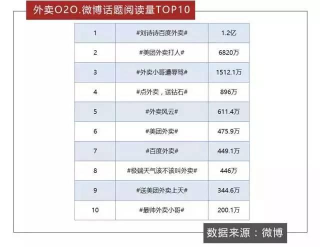 在新浪微博上,關(guān)于外賣O2O的話題高達幾百個,其中#劉詩詩百度外賣#以1.2億的閱讀量高居榜首。