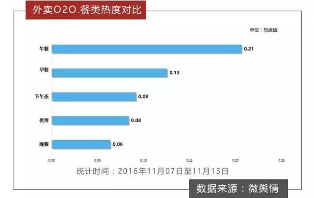 從用戶的訂餐喜好來看,在外賣O2O平臺提供的正餐中,午餐最受網(wǎng)友關(guān)注,熱度值為0.21。