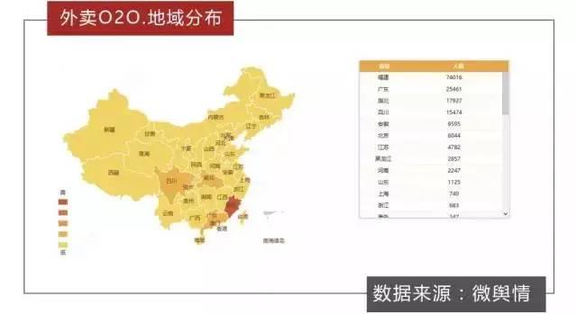 從用戶群的地域分布來看,福建、廣東、湖北成為了關(guān)注外賣O2O網(wǎng)友人數(shù)最多的前三個地域。