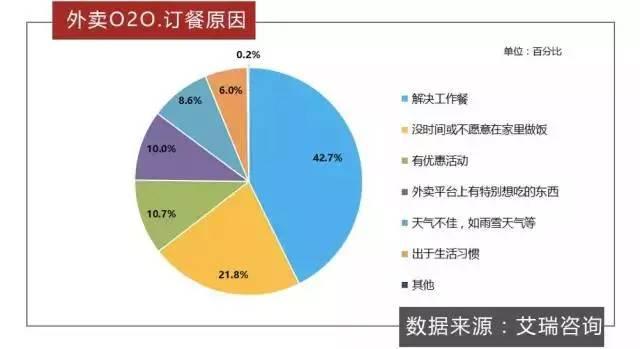 而關(guān)于選擇外賣O2O的原因,42.7%的用戶點外賣是為了解決工作餐;21.8%的用戶是由于沒時間或不愿在家做飯;近一成的用戶是因為有優(yōu)惠活動或外賣平臺上有特別想吃的餐品,8.6%的用戶是由于天氣不佳,也有6.0%的用戶表示外賣O2O已經(jīng)成為了他們的生活習(xí)慣。