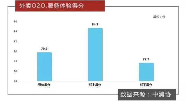 根據(jù)中國消費者協(xié)會對外賣O2O服務(wù)體驗的調(diào)查結(jié)果顯示:外賣O2O服務(wù)整體得分為79.8分,其中線上體驗得分為84.7分,線下體驗得分為77.7分。這說明相對于線上訂餐的體驗情況,線下送餐服務(wù)及送餐質(zhì)量體驗部分存在的問題相對突出。