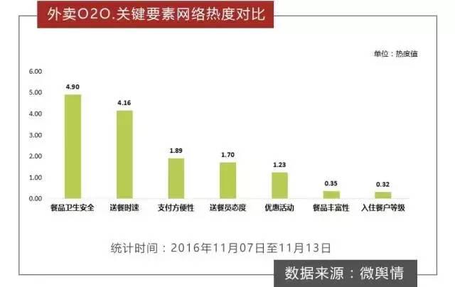 此外,根據(jù)數(shù)據(jù)統(tǒng)計,在外賣O2O的幾大要素中,“餐品衛(wèi)生安全”和“送餐時速”的網(wǎng)絡(luò)熱度值相對較高,這也在側(cè)面說明網(wǎng)友對外賣O2O的“安全”和“時速”更為關(guān)注。